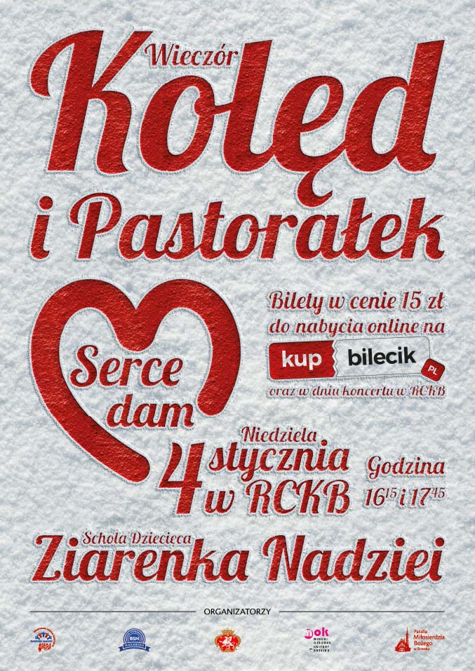 - Ziarenka Nadziei serdecznie zapraszają na wieczór kolęd i pastorałek pt. "Serce dam". Koncerty odbędą się w Regionalnym Centrum Kulturalno-Bibliotecznym w niedzielę 4 stycznia o godzinie 16:15 i 17:45. Bilety dostępne online na stronie KUPBILECIK.PL. Więcej informacji na plakatach i stronie internetowej - kliknij TUTAJ.