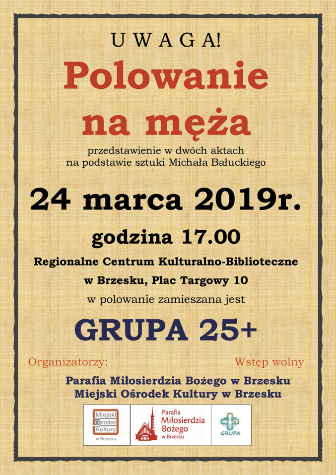 GRUPA25+ działająca przy parafii Miłosierdzia Bożego w Brzesku oraz Miejski Ośrodek Kultury serdecznie zapraszają na przedstawienie pt. "Polowanie na męża", które odbędzie się Regionalnym Centrum Kulturalno - Bibliotecznym w Brzesku 24 marca 2019r., niedzielę, o godzinie 17.00. Bezpłatne wejściówki można odebrać w kasie RCKB.