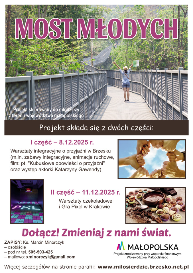 Parafia pw. Miłosierdzia Bożego w Brzesku realizuje projekt „Most młodych”, którego celem jest integracja, rozwój oraz twórcze wsparcie młodzieży z terenu województwa małopolskiego. Inicjatywa powstaje przy wsparciu finansowym Województwa Małopolskiego i ma na celu stworzenie przestrzeni sprzyjającej budowaniu relacji, rozwijaniu talentów oraz poszerzaniu horyzontów młodych uczestników.