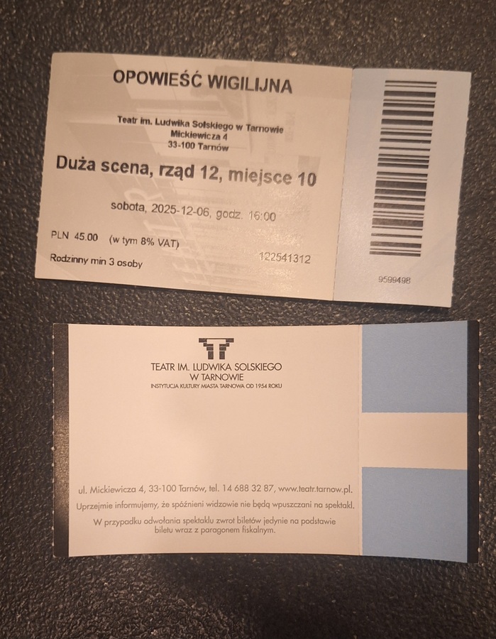 Pierwsza część projektu odbyła się 6 grudnia 2025 r. Tego dnia uczestnicy udali się do Teatru im. Ludwika Solskiego w Tarnowie na poruszającą i pełną refleksji sztukę pt. „Opowieść wigilijna”. Dla wielu osób był to pierwszy kontakt z teatrem od wielu lat. Sala wypełniona była po brzegi, a wydarzenie dostarczyło uczestnikom wielu wzruszeń i niezapomnianych emocji.