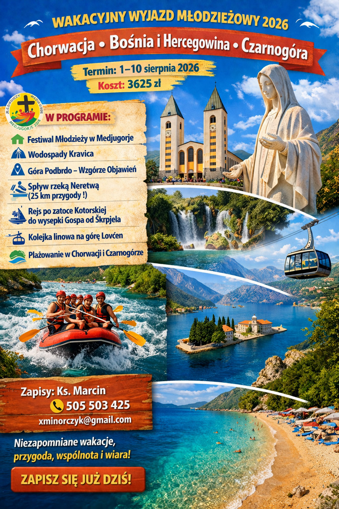 Zapraszamy młodzież na wyjątkowy wyjazd wakacyjny w dniach 1–10 sierpnia 2026 r., łączący duchowe doświadczenia z wypoczynkiem nad morzem. Podczas podróży uczestnicy będą mogli wziąć udział w Festiwalu w Medjugorie, doświadczyć wspólnej modlitwy i koncertów religijnych, a także spędzić czas na relaksie i plażowaniu w malowniczych zakątkach Chorwacji i Czarnogóry.
