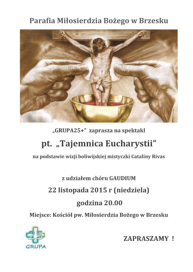GRUPA25+ działąjaca przy naszej parafii oraz Parafialny Chór GAUDIUM zapraszają na spektakl pt."Tajemnica Eucharystii" oparty na wizji boliwijskiej mistyczki Cataliny Rivas. Premiera odbędzie 22 listopada 2015 r w niedzielę o godzinie 20.00 w Kościele pw. Miłosierdzia Bożego w Brzesku.