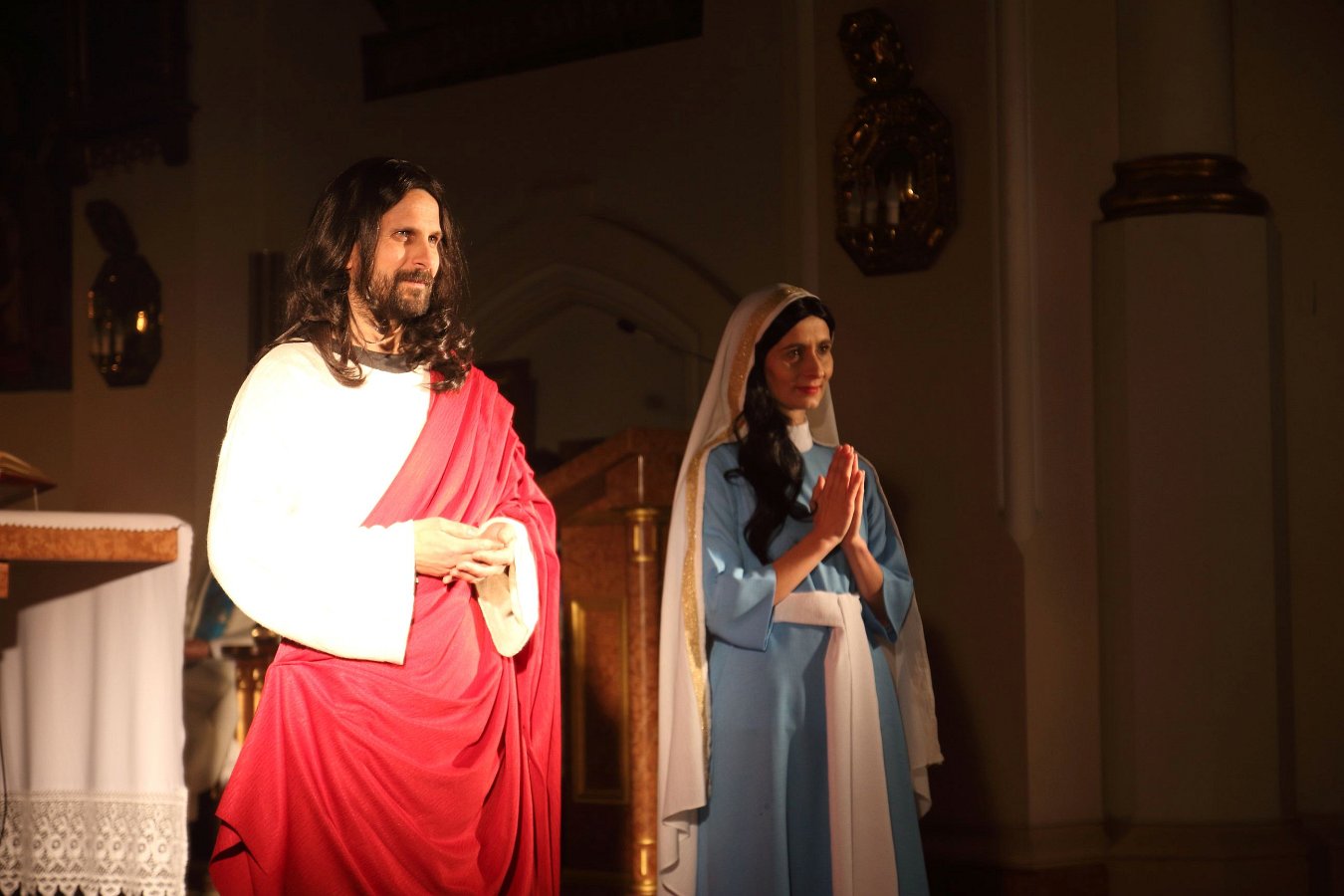 Wnętrze neogotyckiej świątyni, mimo niesprzyjającej aury, wypełniła głównie młodzież przygotowująca się do sakramentu bierzmowania wraz z księdzem wikariuszem Norbertem Sadko, ale przyszli także ich rodzice, rodziny, parafianie w różnym wieku. Kilkoro młodych ludzi z Jadownik wzięło aktywny udział w misterium wcielając się w role aniołów, a po spektaklu dwa z nich wręczyły w podziękowaniu „ kosz obfitości” na ręce p. Ewy Łupińskiej – Toroń, liderki GRUPY25+.
