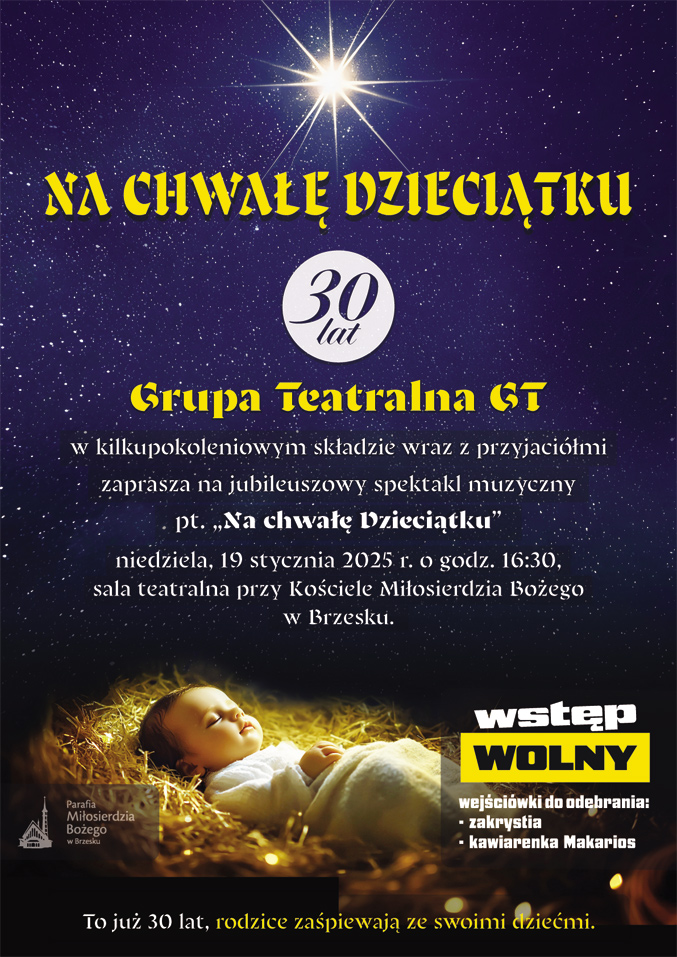 Grupa Teatralna GT świętująca 30-lecie swej działalności w kilkupokoleniowym składzie wraz z przyjaciółmi zaprasza na jubileuszowy spektakl muzyczny pt. "Na chwałę Dzieciątku" w niedzielę 19 stycznia 2025 r. o godz. 16:30 do sali teatralnej przy Kościele Miłosierdzia Bożego w Brzesku. Rodzice wystąpią ze swoimi dziećmi. Wstęp wolny. Wejściówki do odbioru w kawiarence Makarios.