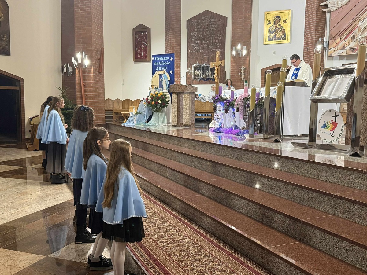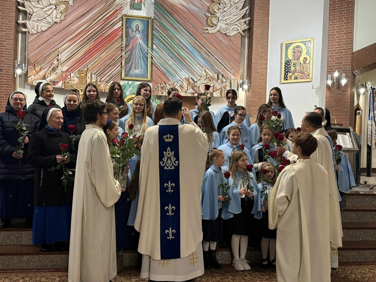 W parafii Miłosierdzia Bożego, w czasie Mszy Świętej, część dziewcząt miała nadane wyższe stopnie DSM-mu. Najmłodsze zostały przyjęta oficjalnie do grona DSM i nadano im stopień Dziecka Maryi. Następnie kolejne dziewczęta były przyjmowane na wyższe stopnie takie jak: Bielanki i Nazaretanki. Pod koniec Mszy dziewczęta wręczyły upominki ks. Proboszczowi oraz opiekunom DSM: Siostrze Sylwii i Księdzu Januszowi. Po zakończonej uroczystości dziewczęta dostały kwiatki i zrobiło sobie pamiątkowe zdjęcia. Wszystkim bardzo dziękujemy. Ave Maryja.