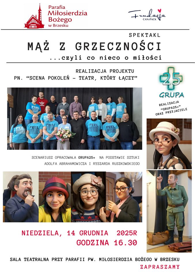 Z ogromną radością dzielimy się z Państwem naszym najnowszym projektem, przygotowywanym przy współpracy z Fundacją CAN-PACK przez parafialny teatr GRUPA25+. „Mąż z grzeczności czyli co nieco o miłości” to wariacja na temat sztuki Adolfa Abrahamowicza i Ryszarda Ruszkowskiego.