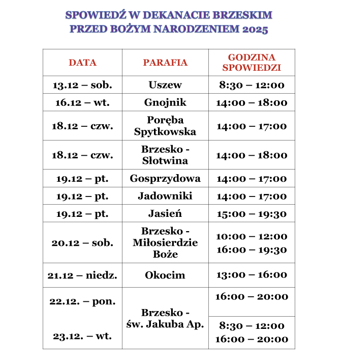 W sobotę 13 grudnia w dekanacie brzeskim, rozpoczną się spowiedzi przed zbliżającymi się świętami Bożego Narodzenia. W naszej parafii przedświąteczna spowiedź odbędzie się w sobotę (tj. 20.12) w godzinach: 10.00 - 12.00 oraz 16.00 - 19.30. Harmonogram spowiedzi w pozostałych parafiach naszego dekanatu przedstawia się następująco:
